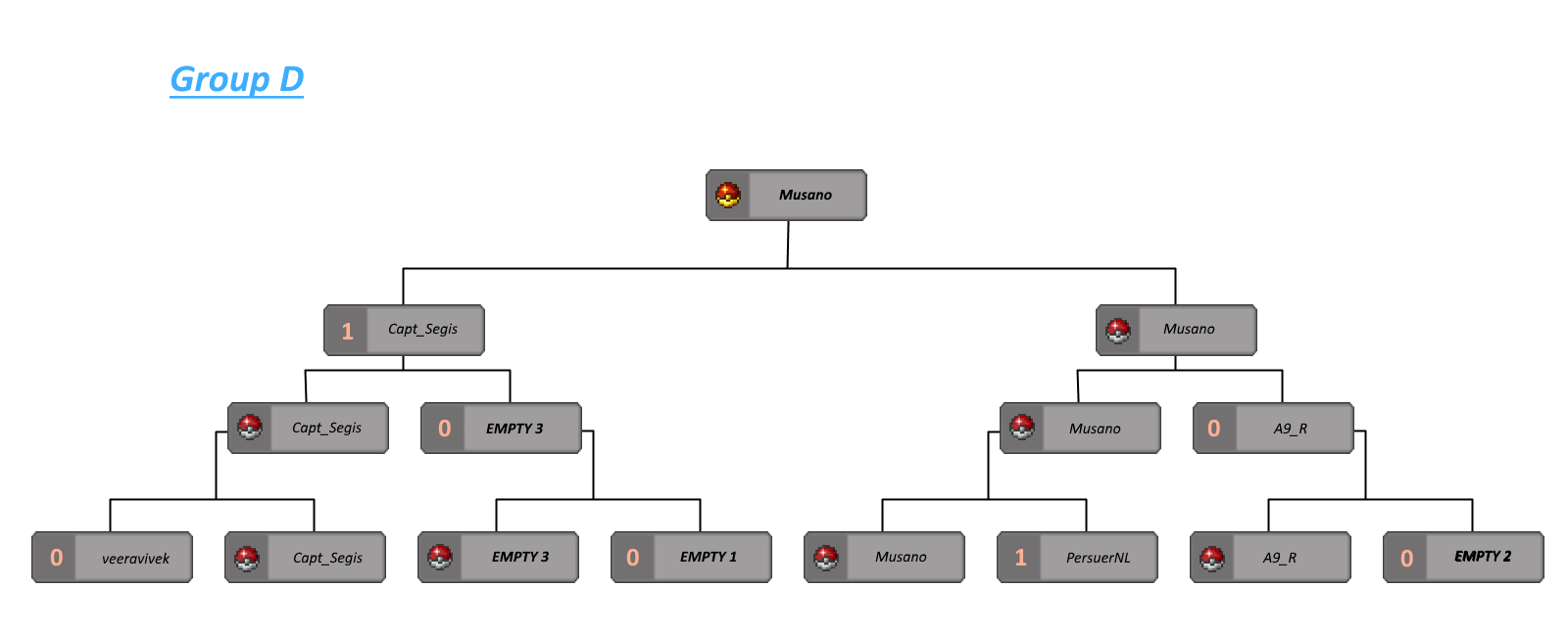 Players are free to change teams between battles. Every battle requires 2 wins to choose a winner. Winner of his battle will battle other winners of his group, simply, ladder system. Also all battles are supposed to happen on AGN server.